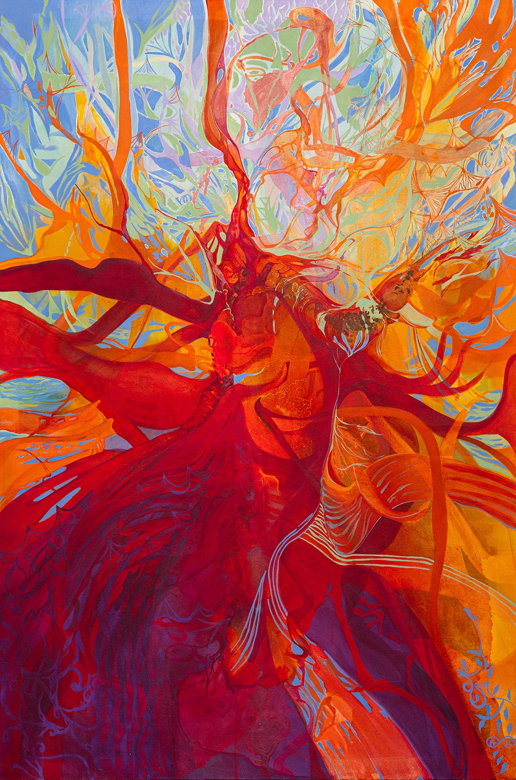 Bryony’s practice moves between the public realm and the studio. She creates collaborative, site-specific installations that bring together film, sculpture, movement and music to form new rituals for a time of climate crisis. Alongside this, her paintings explore the body as fluid, porous and deeply connected to the natural world, guided by her intuitive ‘wild drawing’ practice.
